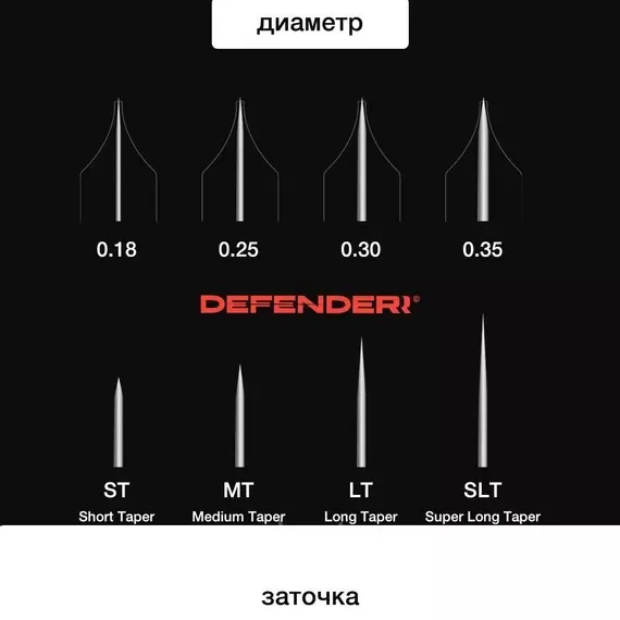 Не смотря на то, что большинство мастеров уже выбрали для себя полюбившиеся конфигурации, к нам поступает много вопросов по поводу огромной линейки картриджей Defenderr. Впервые на рынке перманентного макияжа появились такие редкие диаметры игл, как 0.18, 0.20, 0.27, и 0.33.