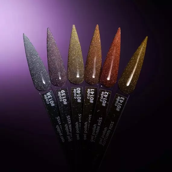 Колекція “Autumn Kiss” – це колекція світловідбиваючих напівпрозорих відтінків. Гель-лаки з цієї колекції мають середньо рідку формулу з додаванням блискіток та кристалів з ефектом “flash”, які відбивають світло. Відтінки колекції можна наносити соло, створюючи мінімалістичний, але водночас вишуканий манікюр, або комбінувати їх між собою для досягнення складніших і глибоких багатовимірних ефектів, а також будуть ідеальним доповненням під основний колір.