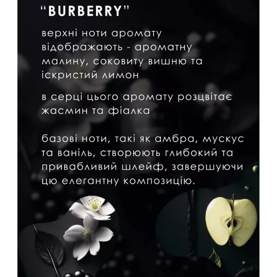 Аромат Burberry — багатогранний, який розкривається поступово, подібно до нішевої парфумерії. Початкові нотки відображають яскраве поєднання ягід і фруктів — стиглу вишню, ароматну малину та соковитий лимон, що надає цитрусової свіжості. У серці аромату ніжно та вишукано пахнуть жасмин і фіалка. Амбра, мускус і ваніль завершують цю чудову хвилюючу композицію, створюючи привабливий шлейф.
