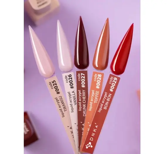 DNKa' Liquid Acrygel — це колекція трьохфазних рідких акрилових гелів, призначених для зміцнення, вирівнювання, нарощування та ремонту нігтьової пластини. Підходить для тонких і чутливих нігтів, має консистенцію середньої густоти. Чудово вирівнює та зміцнює як короткі, так і довгі нігті. Гель не деформується під час носіння і зберігає ідеальну форму та архітектуру нігтів до корекції. Продукт має широку кольорову гаму з різною ступенем пігментації: від прозорого витражу до ідеального білосніжного кольору з 100% покриттям.