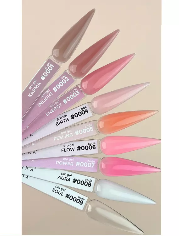 DNKa’ Pro GeI — це колекція універсальних, низькотемпературних гелів трифазної системи нового покоління для зміцнення та всіх типів нарощування нігтів. Завдяки низькому рівню кислотності, абсолютно безпечний для нігтьової пластини. Підходить для тонких і чутливих нігтів. DNKa’ Pro GeI має рідку (ближу до середньої) консистенцію, матеріал належить до класу «твердих» покриттів. Не деформується під час носіння, зберігає ідеальний відблиск до корекції. Має чудовий липкий шар, що сприяє бездоганному зчепленню з нігтьовою пластиною. Рекомендується наносити під гель-підкладку тонким шаром DNKa’ Rubber Base/Nano Base/Fiber Base.