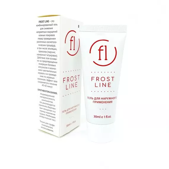 Склад: Вода, Анестомін, Карбомер, ПЕГ-40, Гідрогенізована Касторова Олія, Феноксіетанол, Натрію Гідроксид, Етилгексилпропандіол.Гіпер алергенний .Первинна анестезія.Під плівку на 1 Frost Light (Фрост Лайн) - це комбінований препарат для зниження неприємних відчуттів шкірних покривів перед проведенням різних косметологічних процедур, у тому числі для епіляції, проколів (пірсингу, татуювання, татуювання). Дія цього гелю без лідокаїну ґрунтується на запобіганні генерації больових імпульсів у закінченнях чутливих нервів та їх проведенню по нервових волокнах. Ефект гелю зберігається протягом 40-60 хвилин. Гель можна використовувати як вдома, так і перед відвідуванням косметологічного кабінету. Індивідуальна непереносимість компонентів. Не рекомендується застосовувати вагітним жінкам під час годування груддю. Необхідний алергічний тест. Лише для професійного використання. Спосіб застосування: Нанесіть гель на неушкоджену ділянку шкіри перед проведенням косметологічних процедур та утріть.