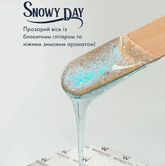Полімерний плівковий віск «Сніжний день» в гранулах ніжно-блакитного кольору. У розігрітому стані віск абсолютно прозорий з блискітками. Гелевий віск наноситься дуже тонким шаром, легко розтягується у великі довгі аплікації. Відмінно зчіплюється з коротким жорстким волоссям. Використовується для депіляції делікатних зон (пахви, бікіні) і великих поверхонь (ноги, руки, спина, живіт, груди). Віск на синтетичній основі, не містить натуральних інгредієнтів, що викликають алергію. Без аромату.
