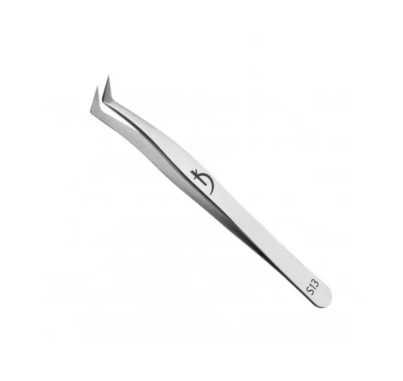 Пінцет для нарощування вій моделі S13 призначений для класичної та об'ємної техніки нарощування. Його робочі краї мають вигнуту форму чобітка, завдяки якій легко працювати навіть із найтоншими віями. Інструмент просто знімає штучні вії зі стрічки, не створюючи на них заломів, а також дозволяє фіксувати їх на повіках. Стане в нагоді для розпушування або формування пучків. Він відрізняється маневреністю та ергономічною формою. Виготовлений з якісної сталі, стійкої до пошкоджень та корозії.