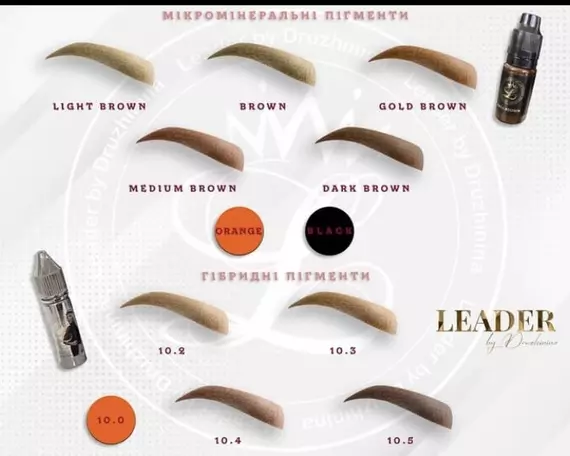 Пігменти Leader від Юліани Дружиніної – це якісний продукт, який має надзвичайно багату палітру кольорів, призначену для перманентного макіяжу. Пігменти Leader легкі у роботі, прості у колористиці, довго тримаються, виглядають натурально, вицвітають рівномірно.