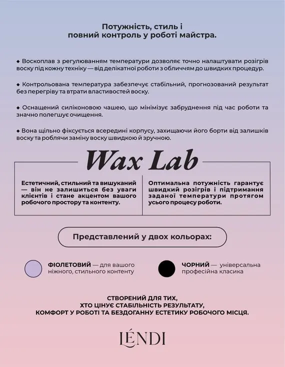 Lendi Wax Lab — це не лише функціональний інструмент, а й естетичний акцент вашого робочого простору, який привертає увагу клієнтів і чудово виглядає у контенті.