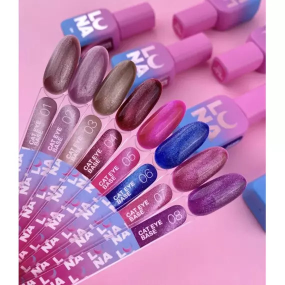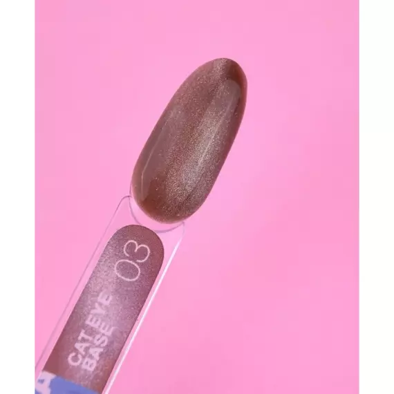 Cat Eye base №3 — це база з ефектом котяче око. У складі продукту є наявні маленькі металеві частинки, які реагують на дію магніту, переміщаючись в ще не заполімеризованому шарі покриття, які забезпечують в результаті дизайн з чарівним відблиском. Вони не вимагають темної підкладки, оскільки мають оптимальну колірну щільність.