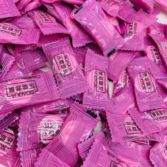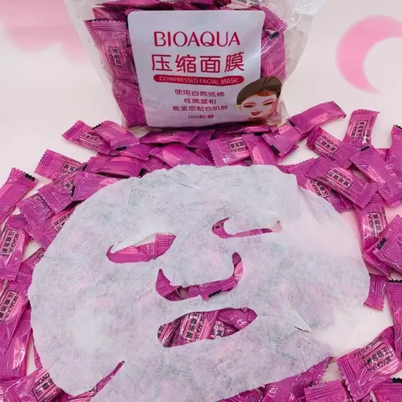 Пресована тканинна маска Bioaqua Compressed Facial Mask у вигляді пігулки виготовлена з високотехнологічного нетканого полотна з прорізами для рота та очей, має 100% натуральний склад. Відповідає формі обличчя, прилягає до шкіри м'яко, але щільно, містить ароматичний екстракт. Таку маску можна просочити будь-яким косметичним рідким засобом: тоніком, лосьйоном, сироваткою, концентратом, ампульними вітамінами, медом, молоком, рослинним соком, тонером, емульсією тощо. Технологія обробки пресованих масок дозволяє їм вбирати найбільшу кількість косметичних продуктів і повноцінно віддавати їх шкірі. Мікропори в полотні маски наповнюються доглядовим продуктом і змушують маску розкритися.