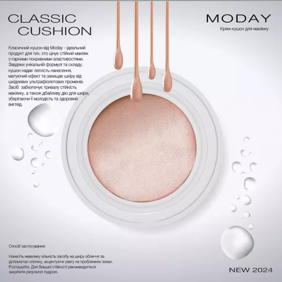 Класичний кушон преміум якості від Moday - ідеальний продукт для тих, хто цінує стійкий макіяж з гарними покривними властивостями. Завдяки унікальній формулі та складу, кушон надає легкість нанесення, матуючий ефект та захищає шкіру від шкідливих ультрафіолетових променів. Засіб забезпечує тривалу стійкість макіяжу, а також дбайливу дію для шкіри, зберігаючи її молодість та здоровий вигляд.