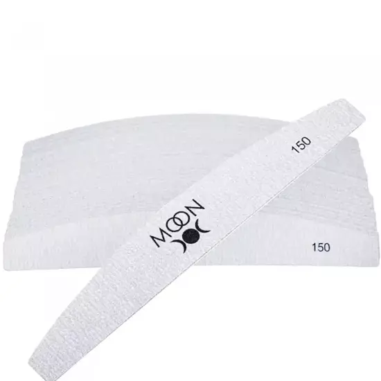 Змінні файли Moon Full у формі півмісяця з абразивністю 150 грит призначені для професійного та домашнього використання під час манікюру і педикюру. Вони легко фіксуються на основі та забезпечують ефективну роботу з натуральними та штучними нігтями.