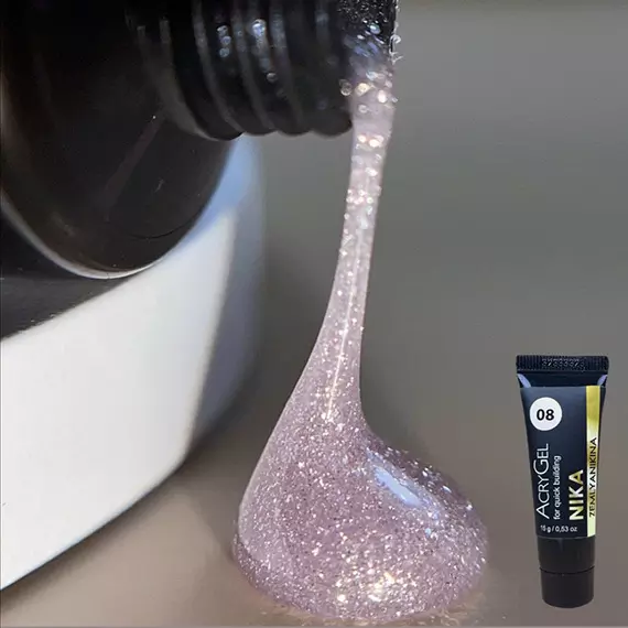 Високоякісний камуфлюючий та мілкозернистий AcryGel by Nika Zemlyanikina поєднав в собі переваги гелевої і акрилової систем. Напівпрозорий рожево-бузковий відтінок з блискітками, який ідеально камуфлює нігтьову пластину, підходить для френчу, різноманітних дизайнів та як самостійне покриття. Без шкідливих для організму речовин, сертифікований в ЄС. Ідеальна консистенція, що нагадує кульку акрилу дозволяє моделювати нігті в будь-якій техніці, з верхніми, нижніми формами або зовсім без форм. Підходить для укріплення та корекції.