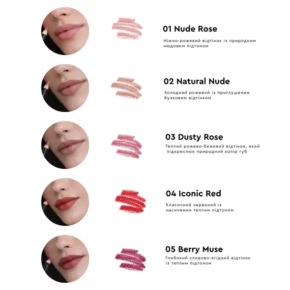 Відтінок Dusty Rose ідеально підходить для тих, хто цінує благородні, складні кольори без надмірної яскравості. Він гармонійно підкреслює форму губ, створюючи акуратний і стильний акцент, та чудово поєднується з холодними й нейтральними образами.