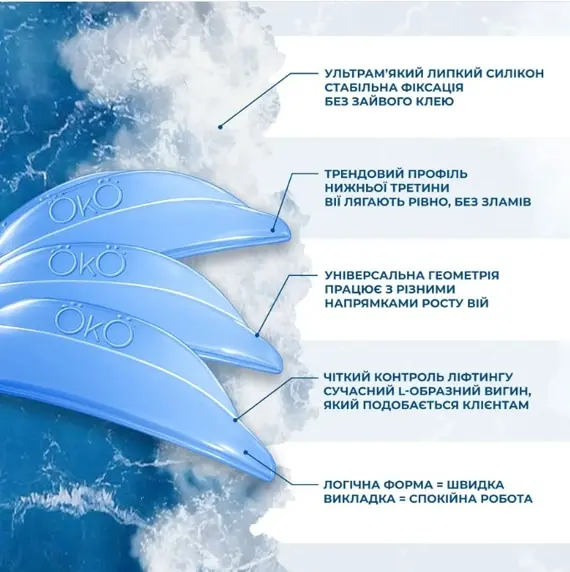 Ocean OKO Lash&Brow — професійні силіконові валики для ламінування вій, призначені для сучасної техніки ліфтингу з чистим підйомом від кореня. Геометрія форми розроблена спеціально для роботи в зоні нижньої третини вії: вії лягають рівно, без заломів, перекрутів та зайвого округлення.