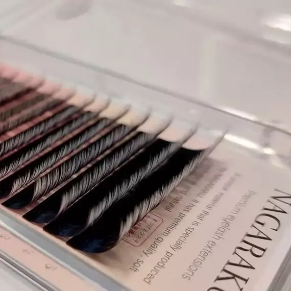 Шикарні гіпоалергенні палетки Nagaraku. Їх відносять до преміум-класу, вони ідеально підійдуть для об'ємного чи класичного нарощування. Вії не заламуються, запам'ятовують вигин і швидко формуються в пучки. Носяться вони до восьми тижнів, додаткового догляду не вимагають. Легко знімаються у процесі корекції