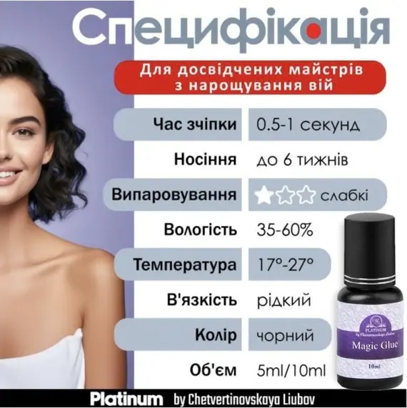 Клей Magic Platinum by Chetvertinovskaya Liubov має швидке зчеплення (0,5-1 секунда). Полімеризується навіть за умов нестандартної температури та вологості. Клей має рідку консистенцію, завдяки якій він не тягнеться за вією і не збирається в грудочки. Клей повністю відповідає вимогам майстра з нарощування вій.