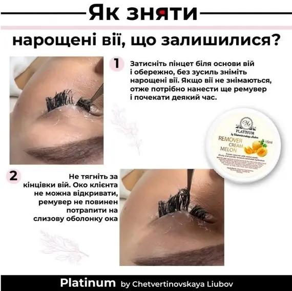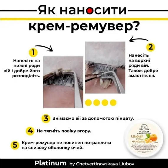 Крем-ремувер PLATINUM by Chetvertinovskaya Liubov забезпечує ефективне і безпечне розчинення клею, при цьому підходить для чутливих очей клієнта. Головною перевагою крем-ремувера є те, що він має густу консистенцію, тому препарат не затікає на слизову оболонку очей.
