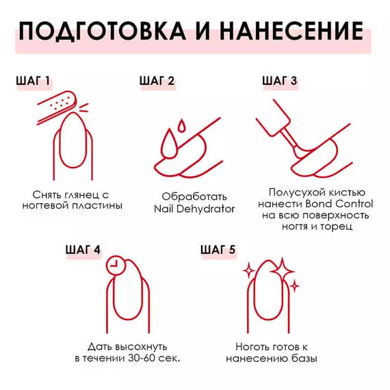 Bond Control имеет тонкую удобную кисточку, которая позволяет максимально равномерно распределить препарат по ноготкам, исключая его затекание на боковые валики и кутикулу. Рекомендуется для обязательного использования перед нанесением базовых покрытий.