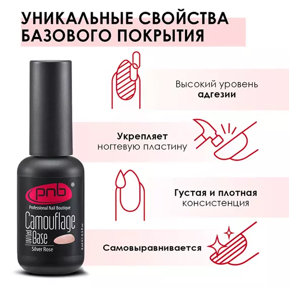 - Без різкого запаху Camouflage Base PNB ідеальна для виконання французького манікюру без додаткових витрат – економія матеріалів та часу майстра та клієнта!