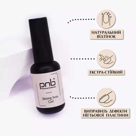 Ексклюзивний матеріал, аналогів якому на ринку не має, Strong Iron Gel PNB — гель-архітектор у флаконі, який поєднує оптимальні властивості жорсткості та зручної консистенції. Користуватися цим продуктом одне задоволення, адже якісний пензлик дозволить з легкістю наносити матеріал навіть майстрові-початківцю. Soak off формула дає змогу розчинити гель за допомогою Gel Remover PNB. Те що треба для роботи з клієнтами, які проти зняття покриття механічним способом. Інноваційний склад Strong Iron Gel PNB збагачено кремнієм. Полімеризований гель — міцний та пружний, відрізняється довшим строком носіння. Спектр використання:- укріплення ідеальної квадратної форми, надміцні кути без сколів та відшарувань;