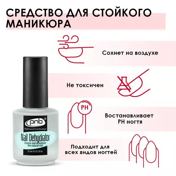 Дегидратор для ногтей PNB — новинка, которая действительно отлично работает. Препарат эффективно и безвредно нейтрализует излишек влаги и жира на ногтевой пластине, значимо улучшить адгезию шеллака, гель-лака и липидного барьера.