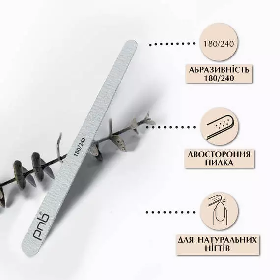 Дерев'яна, вузька, краплеподібної форми, ергономічна пилка. Застосовується для обпилювання натуральних нігтів. Абразивність: 180/240 гріт