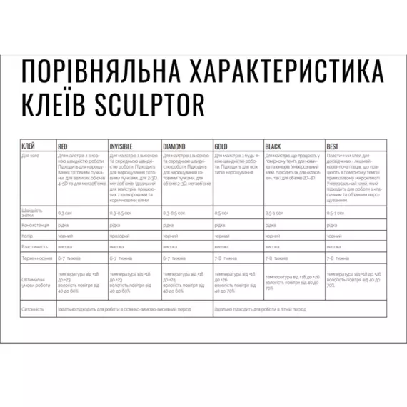 SCULPTOR BEST – це саме той чорний клей для вій, який є незамінним для проведення процедури нарощування в літній період. Він ідеальний для застосування в діапазоні температур від +18 до +26°С при вологості повітря 40-70%.