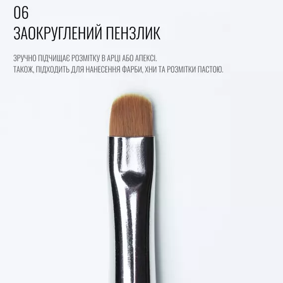 Округлений пензлик – це один із обов'язкових продуктів, який має бути у кожного майстра. Зручно підчищає розмітку в арці або апексі, а також підходить для нанесення фарби, хни та розмітки пастою. Цей пензель забезпечує точність і акуратність, створюючи рівні контури та чіткі лінії.