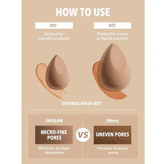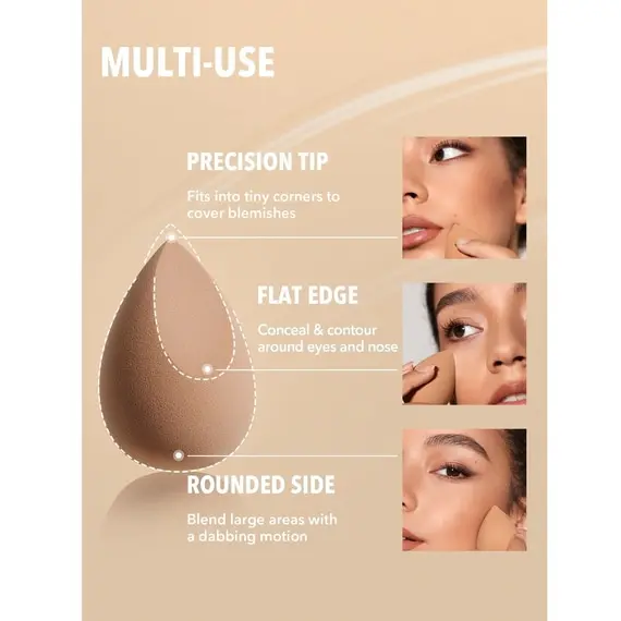Спонж у вигляді краплі зі скосом . За допомогою широкого боку Ви можете легко розподілити тональне по всій поверхні обличчя, а завдяки загостреному кінчику і скосу пропрацювати дрібні ділянки. Спосіб застосування: спонж необхідно змочити у воді, в результаті чого, він повинен збільшитися вдвічі, вичавити його. Після цього невелику кількість тонального засобу нанести на спонж. Злегка торкаючись, покрийте засобом шкіру масажними лініями. Якщо є різкі переходи кольорів, згладьте їх спонжем.