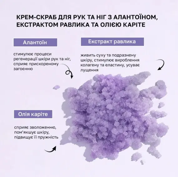Ключові переваги крем-скрабу для рук та ніг з алантоїном, екстрактом равлика та олією каріте Shelly: