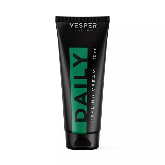 Спеціальна формула для догляду за татуюваннями на основі крему Vesper Healin Daily включає воду, олію кокосу раф., цетеариловий спирт, д-пантенол (7%), ПЕГ-40, соєвий віск, олію кунжутну, рослинний ланолін, гліцерин, консервант, які поглинаються шкірою для зволоження та загоєння.