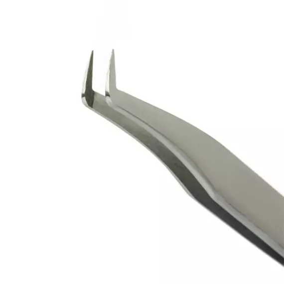 Легкий, надміцний пінцет для розділення вій при нарощуванні. Широка, плавно вигнута форма з гострими кромками під кутом 90 градусів. Кінчики мають насічки Fiber Tip всередині, що протидіють ковзанню та міцно тримають вії. Вони щільно змикаються і надійно захоплюють будь-які за товщиною та довжиною штучні вії.
