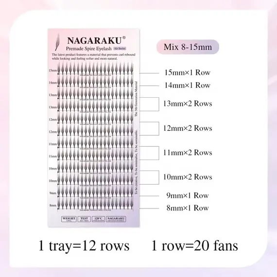 Цей мікс 8-15 мм ідеально підходить для майстрів, які хочуть додати своїм роботам ефект аніме (Spire) або створити легкий і чарівний ефект (Fairy) чи щільний і багатошаровий (Wings) ефект щобдосягти більш об'ємного, виразного вигляду. Вії Nagaraku мають ідеальну форму та структуру, що дозволяє з легкістю працювати з ними, а їх чорний колір додає глибини та інтенсивності образу.