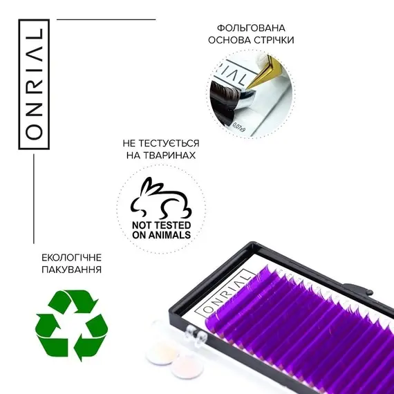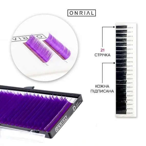 Для виразних акцентів та яскравих образів. Мають яскравий, насичений фіолетовий колір, гнучке легке волокно, добре знімаються зі стрічки та формуються у пучок. Вії оцінять майстри, що працюють як у ручній так і стрічковій техніці, оптимальна липкість стрічки робить процес нарощування комфортним. В асортименті завиток D і L товщиною 0.07 мм. Палетки мікс із 21 стрічкою в розтяжці довжин 6-13.
