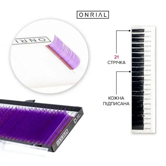Для виразних акцентів та яскравих образів. Мають яскравий, насичений фіолетовий колір, гнучке легке волокно, добре знімаються зі стрічки та формуються у пучок. Вії оцінять майстри, що працюють як у ручній так і стрічковій техніці, оптимальна липкість стрічки робить процес нарощування комфортним. В асортименті завиток D і L товщиною 0.07 мм. Палетки мікс із 21 стрічкою в розтяжці довжин 6-13.