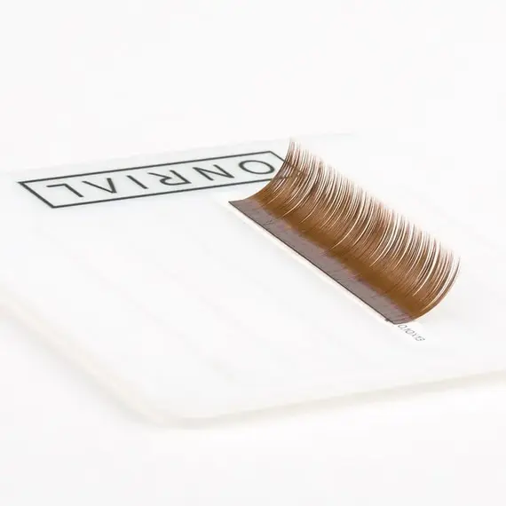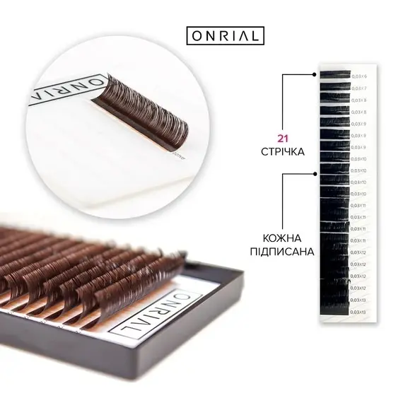Нова серія вій у насиченому коричневому кольорі. М'які, легкі вії, комфортні в роботі та носінні. У виробництві цієї лінійки продукції використовується нове волокно, яке дозволяє швидше і комфортніше формувати пучок. Вії добре тримають вигин, не ламкі добре знімаються зі стрічки. Коричневі вії чудово підійдуть блондинкам, а також для моделювання максимально природного погляду. Упаковка вій містить 21 стрічку. Також палетки Onrial відрізняються продуманим дизайном підкладки, містять повну інформацію про довжину вій, мають спеціальний відривний клапан для комфортного зняття стрічок.
