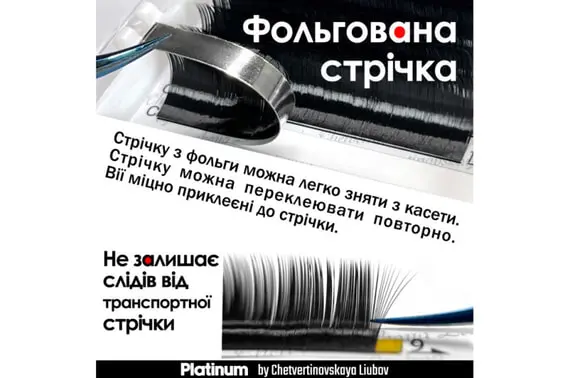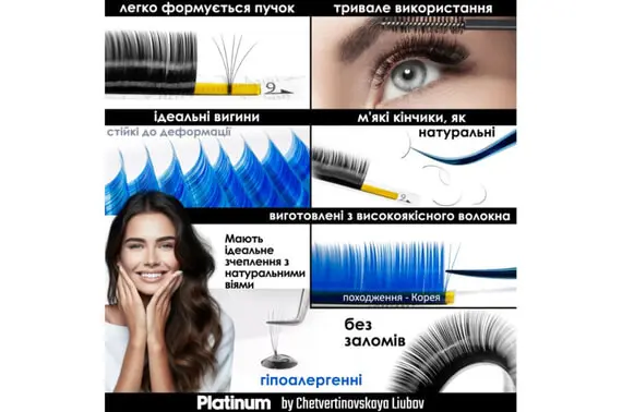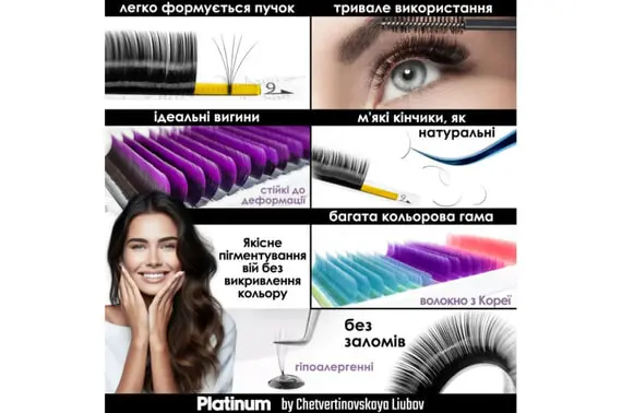 Вії PLATINUM by Chetvertinovskaya Liubov - це результат багаторічного досвіду розробок у сфері виробництва матеріалів для нарощування вій. При їх виробництві враховано всі побажання майстрів з нарощування вій. Наша продукція відповідає світовим стандартам якості.