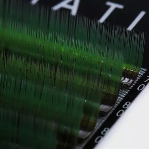 Оригінальні кольорові вії PRIZMATIC 2Т Green завтовшки 0,07 мм характеризуються мʼякістю та пружністю, а також делікатним блиском. Волокно розташоване на якісній фольгованій основі, завдяки чому майстрам дуже зручно працювати з ним.