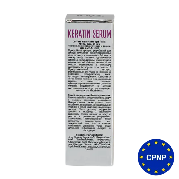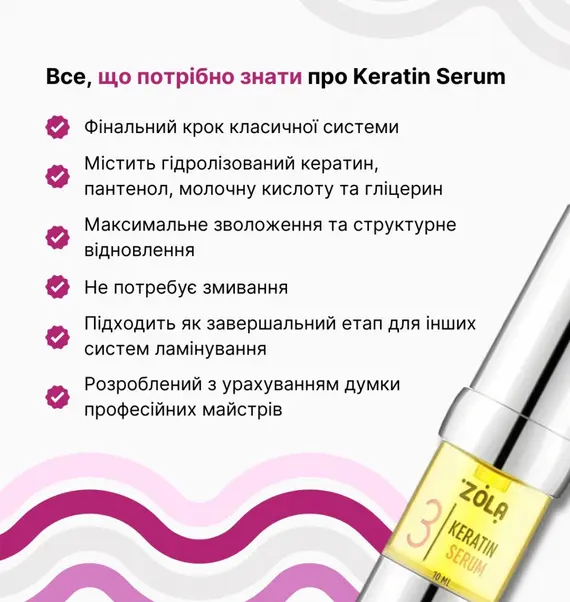 ZOLA склад для ламінування 03 Keratin Serum Крок 3. Унікальний комплекс по догляду за бровами і віями, що містить в своєму складі гідролізований кератин, гліцерин, пантенол, молочну кислоту, які насичують і зволожують волосся зсередини. Компоненти даного складу повністю вбираються в волосся за кілька хвилин, ефективно проникають всередину волосся і зміцнює їх. Не залишає ефекту жирності після процедури. Переваги продукту: